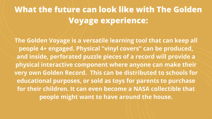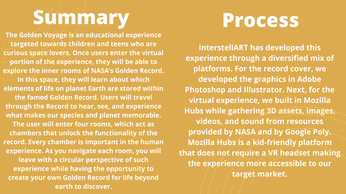 In this 48-hour global hackathon, I procured and designed 3D elements to input into our virtual world designed in MozillaHubs. My team and I focused built the experience with inspiration from the Golden Disk to showcase the impact one individual can have on our world that can be shared with another. We were awarded with "Global Finalists" by being one of the top 40 finalist projects out of over 1,200 projects submitted across the world.